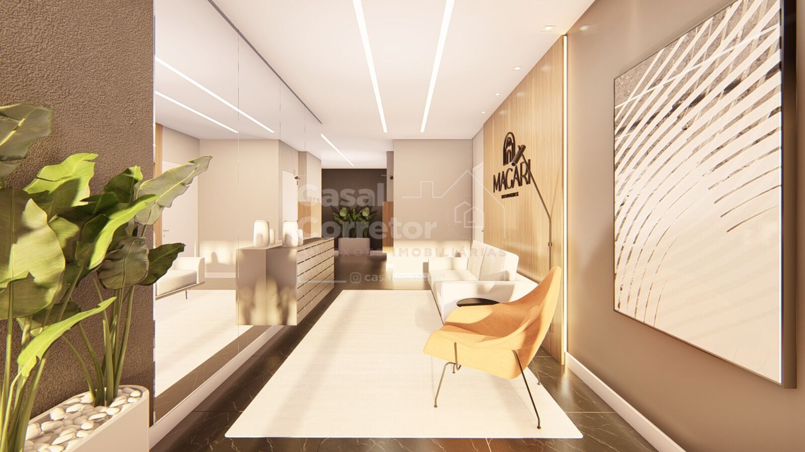 As cores e materiais utilizados no hall de entrada trazem o ar da contemporaneidade. O mobiliário moderno e minimalista cria a sensação de aconchego.