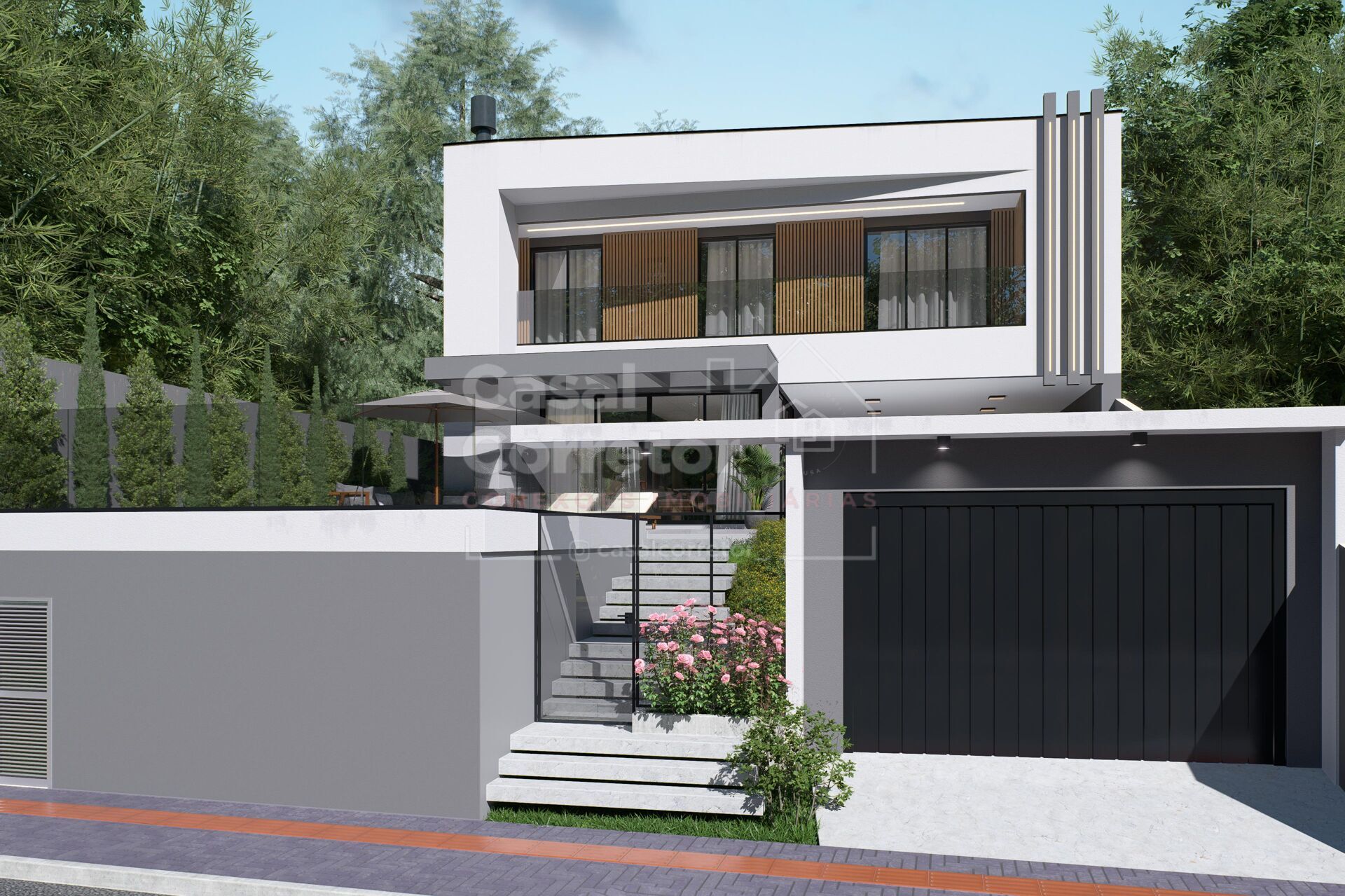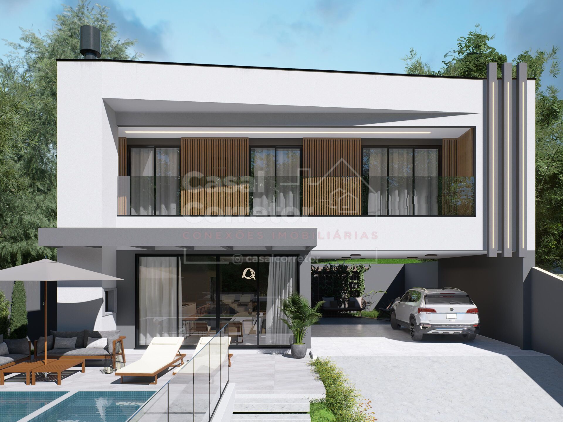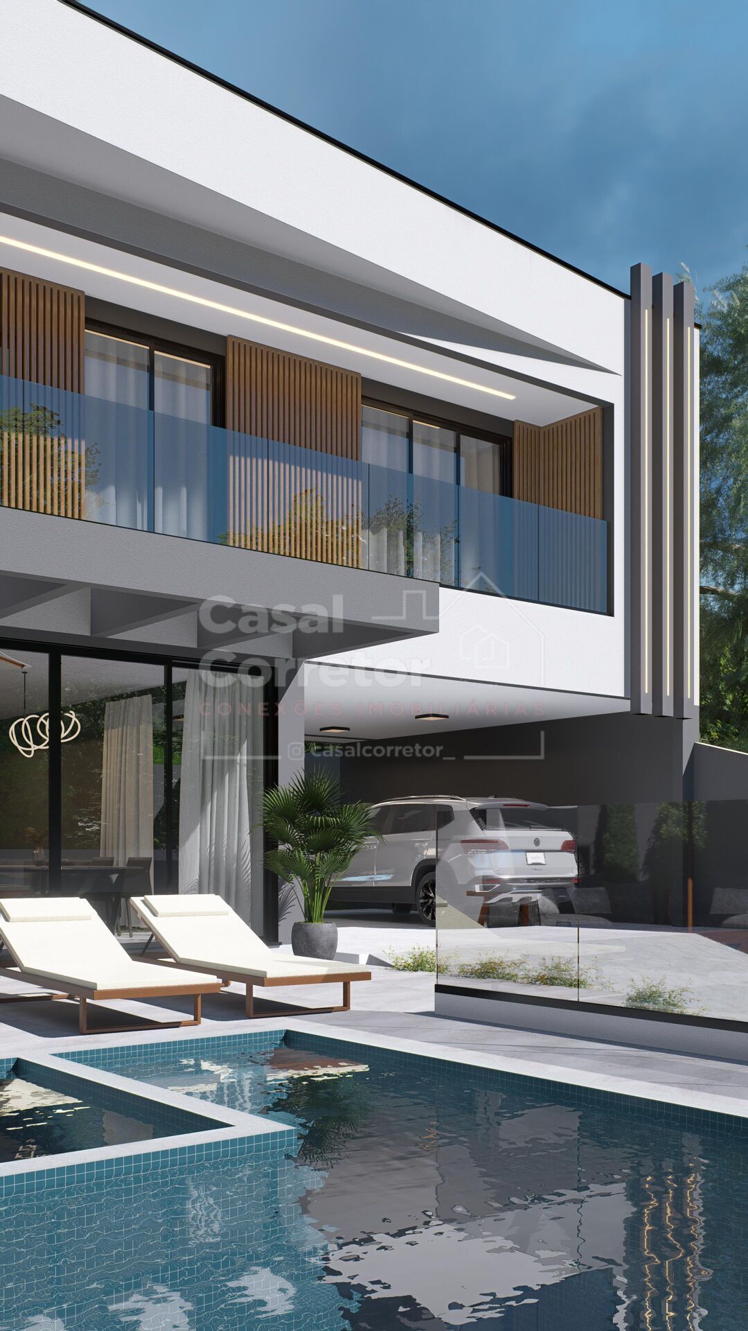 O terreno possui espaço para piscina ou ofurô, além de jardim frontal, paisagismo com iluminação externa e uma fachada moderna que impressiona. O acabamento inclui porcelanato e piso vinílico de alta qualidade.